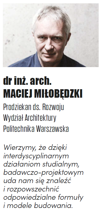 Większość współczesnych nurtów architektonicznych opiera się na założeniu, że materializacja ich idei zależy w głównej mierze od rozbudowanych systemów i rozwiązań technicznych. Architekci oddają coraz więcej decyzji w ręce specjalistów innych dziedzin, ustanawiających własne reguły, niekoniecznie podporządkowane celom projektowym. Wierzymy, że dzięki interdyscyplinarnym działaniom studialnym, badawczo projektowym uda nam się znaleźć i rozpowszechnić odpowiedzialne formuły i modele budowania, które odwrócą ten trend, pozwolą budować prościej, mądrzej bez konieczności sztucznego, wspomagania ze strony złożonych technologii. Jest to coraz częściej postrzegane jako istotne wyzwanie chwili. Nasz Wydział otwarty jest na współpracę i wymianę myśli w tej dziedzinie. W najbliższym czasie odbędzie się u nas międzynarodowa konferencja Design in Foyer połączona z rozdaniem nagród Design Educates Awards. Wielu znakomitych uczestników tego wydarzenia przywiązanych jest nie tylko do idei łączenia działań edukacyjnych z projektowaniem, prototypowaniem jako formą działalności badawczej, nakierowanej na poszukiwania prostych formuł budowania w oparciu o bardzo złożone, technicznie zaawansowane, holistycznie zorientowane studia. Równie ważnym zadaniem architektury jest działanie na rzecz budowania świadomych swoich celów wspólnot ludzkich. W tym kontekście znaczącym wydarzeniem była doroczna międzynarodowa konferencja zorganizowana przez naszą szkołę „Architecture of Challenges: New European Bauhaus – Building Community 2025”. Wykłady, dyskusje i spotkania odbyły się między innymi w Pałacu na Wodzie w Łazienkach Królewskich. W Parku Łazienkowskim powstał też kolejny, zbudowany przez naszych studentów pawilon – miejsce spotkań i popularyzowania idei odpowiedzialnego budowania.