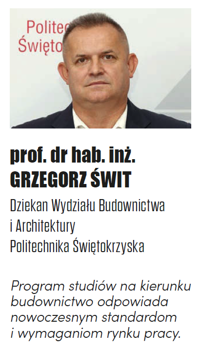 Wydział Budownictwa i Architektury funkcjonuje w strukturze Politechniki Świętokrzyskiej, jednej z najnowocześniejszych uczelni w Polsce. Zwarty kampus uczelni wraz z bazą sportową i socjalną należy do wyróżniających się symboli regionu. Wydział Budownictwa i Architektury ukierunkowany jest na wysoką jakość edukacji, badania naukowe oraz współpracę społeczno-gospodarczą. Wydział w dziedzinie inżynieria lądowa i transport może poszczycić się kategorią A jakości działalności naukowej otrzymaną w ostatniej ocenie parametrycznej. Wysoki poziom infrastruktury badawczo-dydaktycznej Wydziału zapewnia 19 laboratoriów wyposażonych w nowoczesną aparaturę. Badania prowadzone są w zakresie materiałów budowlanych, technologii betonu, materiałów i nawierzchni drogowych, diagnostyki obiektów technicznych z wykorzystaniem technik bazujących na analizie BIG DATA oraz procedurach tzw. obiektów inteligentnych samodiagnozujących się. Badania prowadzone na światowym poziomie pozwalają na współpracę Wydziału z najlepszymi ośrodkami na świecie. Należy dodać, że naukowcy naszego Wydziału corocznie doceniani są za nowatorskie projekty i rozwiązania, skutecznie pozyskują środki finansowe na realizowane projekty badawczo –rozwojowe krajowe i międzynarodowe. Proces dydaktyczny zapewnia wykwalifikowana kadra, która stosuje najlepsze metody i narzędzia, a także nowoczesną aparaturę, co wpływa na zwiększenie poziomu jakości edukacji oraz wszechstronnego rozwoju studentów. Wydział podejmuje dodatkowe inicjatywy w ramach doskonalenia kształcenia poprzez organizację branżowych szkoleń i warsztatów, konferencji, a także wyjazdów edukacyjnych. Studenci pogłębiają i praktycznie wykorzystują zdobytą wiedzę i umiejętności w ramach działalności 11 kół naukowych. Serdecznie zapraszam do studiowania na naszym Wydziale.\